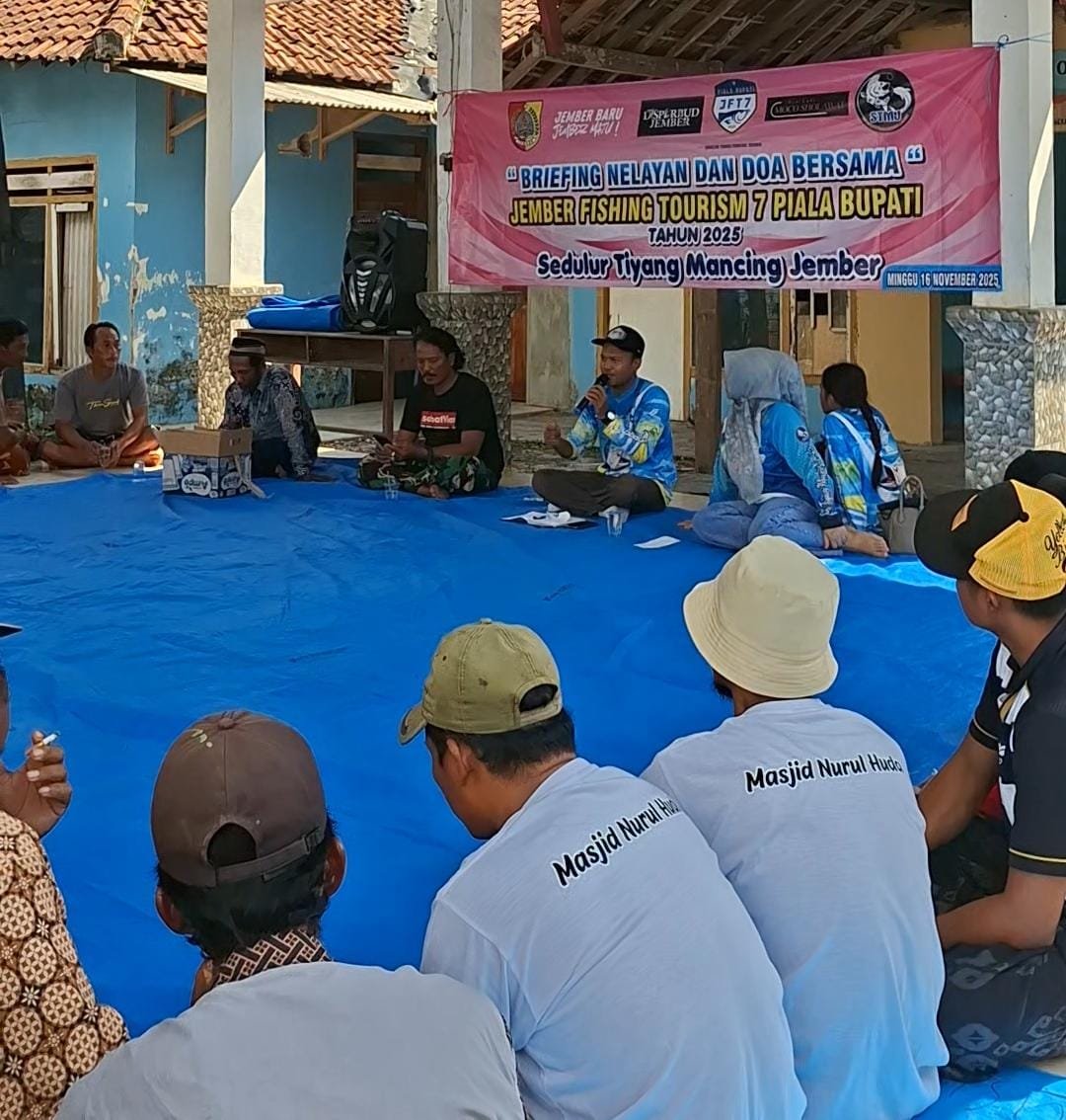 Jember, Sebanyak 100 nelayan mengikuti kegiatan Briefing Nelayan dan Doa Bersama menjelang pelaksanaan Jember Fishing Tourism (JFT) 7 Piala Bupati 2025. Acara yang digelar oleh komunitas Sedulur Tiyang Mancing Jember (STMJ) tersebut berlangsung di balai dusun watu ulo dengan suasana hangat dan penuh kebersamaan,16/11/25 siang.